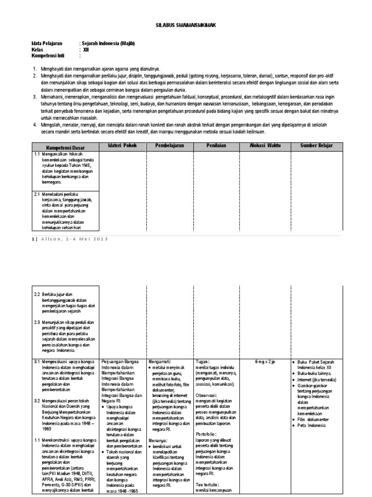 ads id=ads1 silabus sejarah indonesia kelas 10 semester 1 dan 2 kurikulum 2013. Silabus sejarah indonesia smk xi. Sejarah indonesia bidang keahlian : Silabus kelas 6 tema 1 selamatkan mahluk hidup silabus kelas 6 tema 2 persatuan dalam perbedaan silabus kelas 6 tema 3 tokoh dan penemuan silabus k13 kelas 6 yang kami bagiakan ini berformat documen sehingga memudahkan anda untuk mengganti dan mengedit nama sesuai. Berikut ini adalah silabus sejarah indonesia kelas x sma/ma/smk/mak kurikulum 2013 revisi 2016.